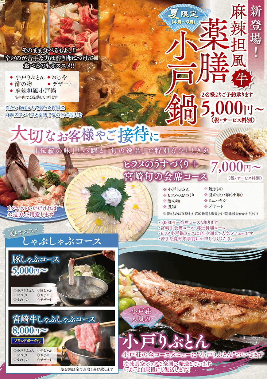 その他、各種会席コースやしゃぶしゃぶ、人気の小戸りぶとんなど充実。