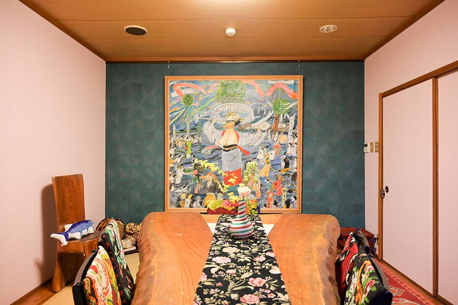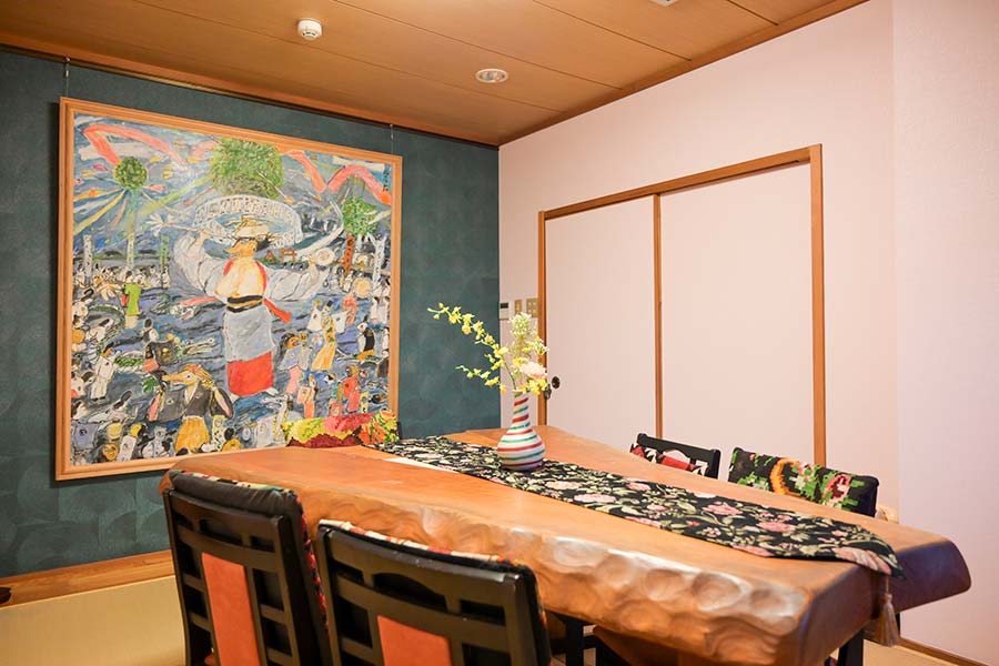 西都市出身の画家・弥勒祐徳(みろくすけのり)先生による、迫力ある神楽の絵が彩る趣深い個室です。