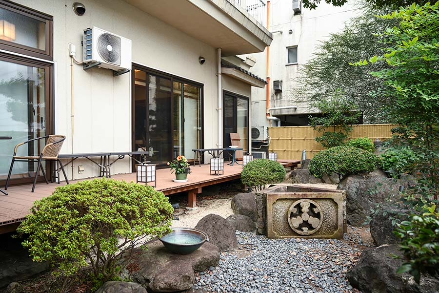 お部屋からは、金屏風越しに庭園の眺めを楽しむことができ、外のデッキに出れば、季節の移ろいを感じながら心安らぐひとときをお過ごしいただけます。